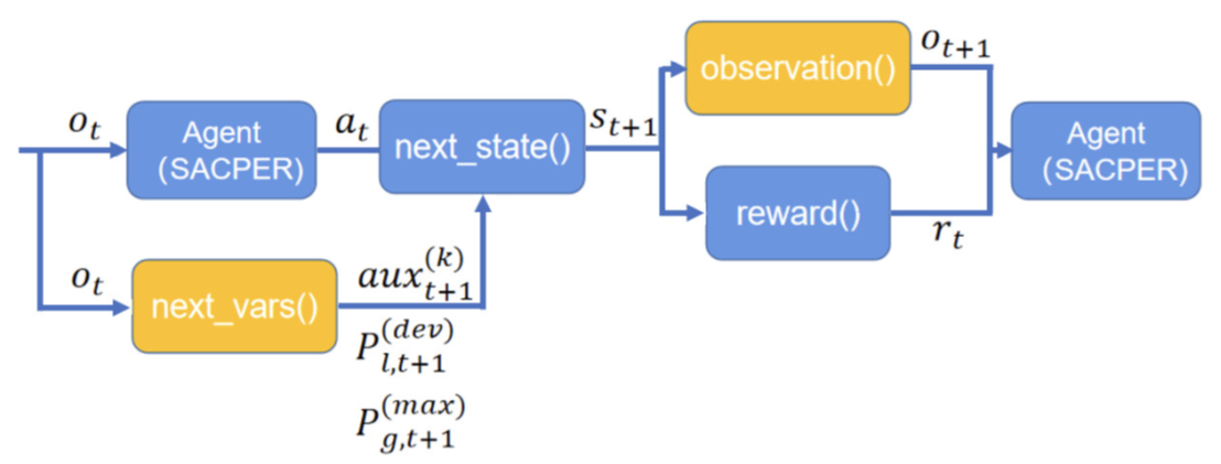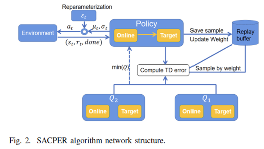 위의 정보들이 리플레이 버퍼에 저장되고 critic , actor network는 이 데이터를 사용하여 td 오류 계산 및 가중치 업데이트, 가중치 업데이트는 두 네트워크의 online에 적용됨